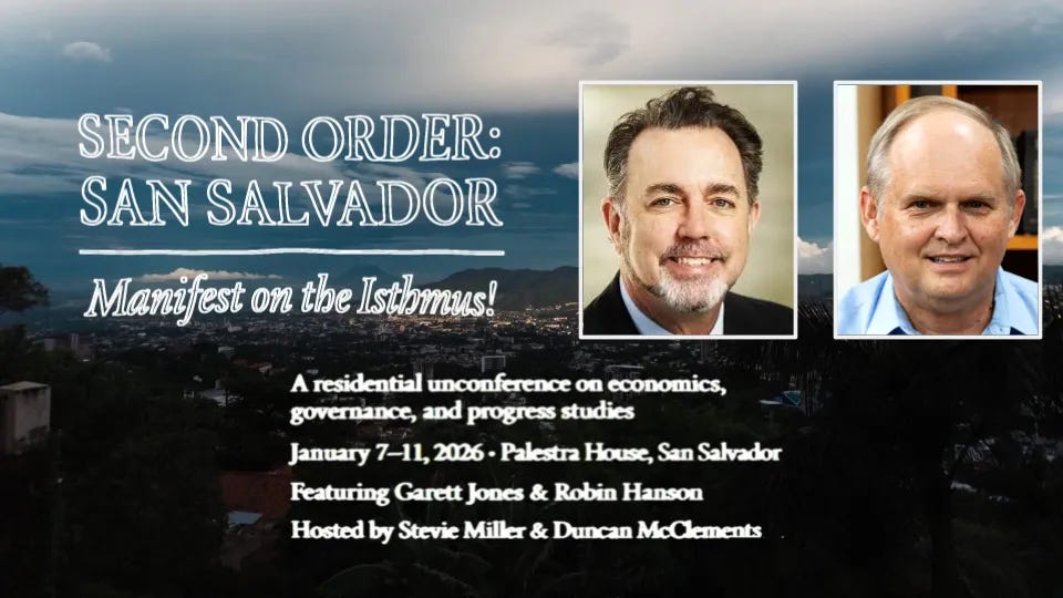 This clip is from a session at Second Order San Salvador, a five-day residential economics unconference hosted by Duncan McClements and me (Jan 7–11, 2027), graciously supported by Emergent Ventures and Jake Hamilton of Palestra. We’re interested in hosting similar events in the future and are currently considering possible follow-ups.